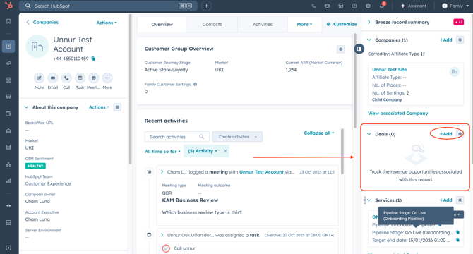 The deal record view will show up after you have created the deal. Notice that the name of the deal (after 2 mins delay) will also be updated.