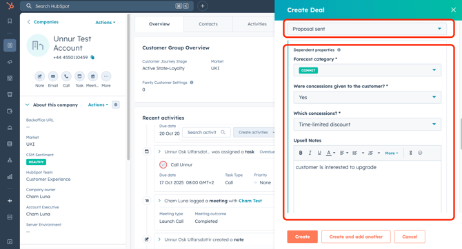 Were Concessions given to the customer? is an additional property that shows up when the Deal Stage is in Proposal Sent, Closed Won, and Closed Lost.