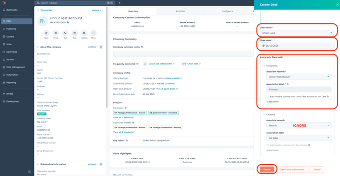 Create Deal panel will pop up on the right side of the screen which will show all relevant properties that need to be accomplished.