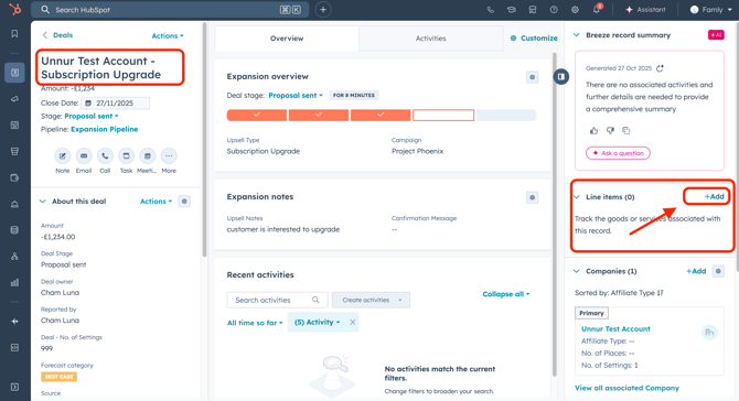 On the right-side panel of the record view, please scroll to the Line items segment and click +Add.