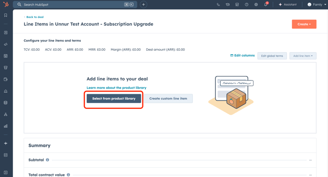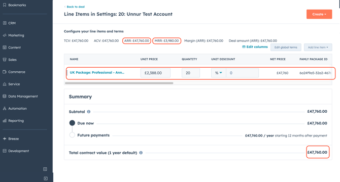 The selected package will then appear on the line item page. The TCV, ACV, and ARR should all reveal the same expected total ARR amount.