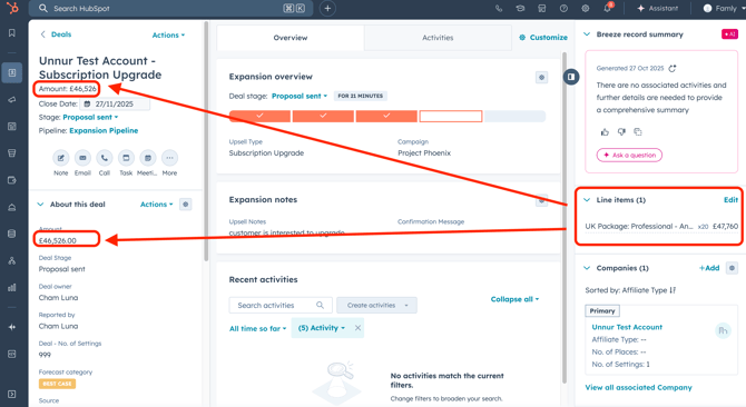You will be brought back to the deal record view where the Amount on the top left panel of the summary shows you the Upsell Value (difference between New ARR and Old ARR derived from the company property)