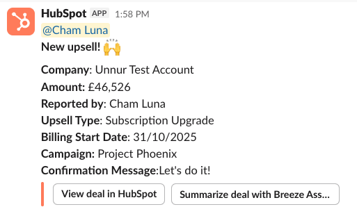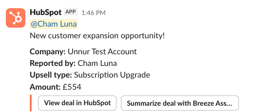 If an expansion deal is moved to Closed Won, the slack notification below will be sent to #upsell